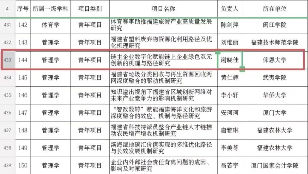 近日,福建省社会科学规划办公室发布了《2025年度福建省社会科学基金项目立项名单》,我院谢晓佳老师主持的“链主企业数字化赋能链上企业绿色双元创新的机理与路径研究”获得青年项目立项。