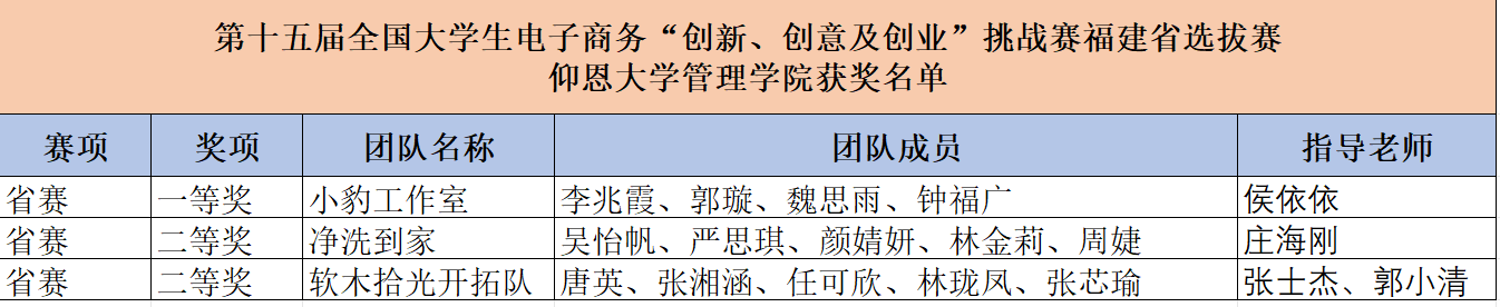 近日,第十五届全国大学生电子商务“创新、创意及创业”挑战赛福建省选拔赛在闽江学院融侨文体中心落下帷幕。太阳成官网共有3支队伍入围线上赛,经过激烈角逐,最终斩获一等奖1项、二等奖2项。