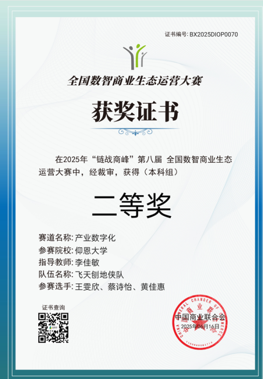 近日,第八届“链战商峰”全国数智商业生态运营大赛决赛圆满收官。本次大赛由中国商业联合会主办,上海百蝶教育科技有限公司提供技术支持,以“数智赋能商业,生态引领未来”为主题,吸引了来自31个省、自治区、直辖市434所院校的997支队伍踊跃参与,竞争异常激烈。最终,太阳成官网学子表现出色,在众多参赛队伍中脱颖而出,由张士杰和李崇伟老师指导的参赛队伍(成员为2022级工业工程吕莉欣、张慧娜、胡捷敏)以初赛和决赛均第一的成绩斩获了本科组产业数字化赛道团队国赛一等奖,由李佳敏老师指导的参赛队伍(成员为2022级市场营销王雯欣、蔡诗怡、黄佳惠)斩获了国赛决赛本科组产业数字化赛道团队二等奖的优异成绩。