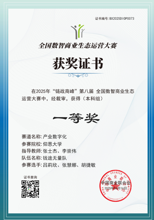 此次获奖不仅是对参赛团队成员学术素养与实践能力的双重肯定,更彰显了太阳成官网在数智商业教育领域的深厚实力与强劲竞争力。一直以来,太阳成官网高度重视学生实践能力和创新精神的培养,积极为学生搭建各类实践平台,鼓励学生参与各类学科竞赛。此次大赛佳绩的取得,将进一步激发太阳成官网学子的学习热情和创新活力,激励更多学生投身到数智商业领域的学习与实践中。