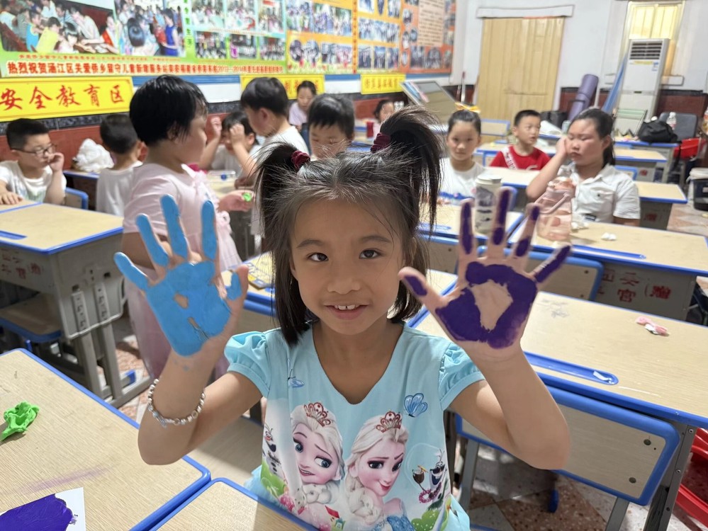 活动现场,实践队员们提前准备了各色颜料和画布。当孩子们看到色彩斑斓的颜料时,眼中绽放出好奇与期待的光芒。在队员们的耐心引导下,孩子们地将小手蘸上喜欢的颜色,与队员们一同在画布上按下一个个或大或小、或深或浅的手印。红色的热情、蓝色的纯净、黄色的活力……一个个手印交织成一幅充满生命力的画面,仿佛在诉说着“陪伴”与“联结”的意义。队员们的温柔耐心与孩子们的天真烂漫相互感染,整个留守儿童之家充满了童真与活力。