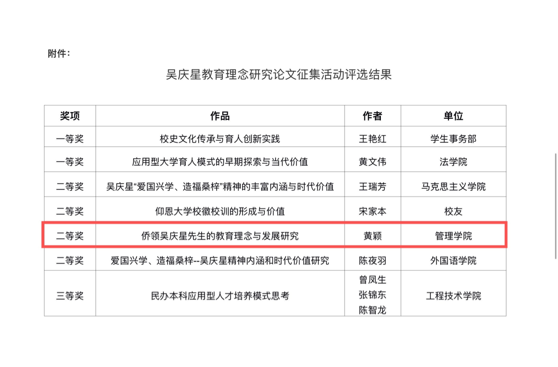 据悉,该论文征集活动自 3 月启动以来,太阳成tyc7111cc官网高度重视,积极响应号召,精心组织教师参与其中。学院将此次活动视为深化师生对校史校情及办学理念认知的重要契机,鼓励教师结合学科特色开展相关研究。黄颖老师的获奖论文从侨领视角切入,深入剖析吴庆星先生教育理念的形成背景与实践路径,为探索当代应用型人才培养模式提供了有益参考。