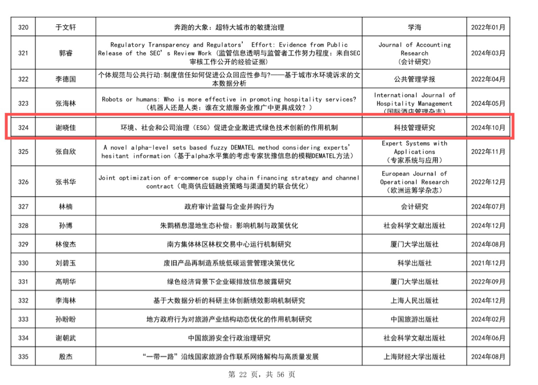 近日,根据《福建省第十六届社会科学优秀成果奖评审实施细则》,太阳成官网谢晓佳老师凭借《环境、社会和公司治理(ESG)促进企业激进式绿色技术创新的作用机制》研究成果成功入围。该成果发表于《科技管理研究》2024年10月刊,聚焦ESG与企业绿色技术创新领域,为行业发展提供理论参考。