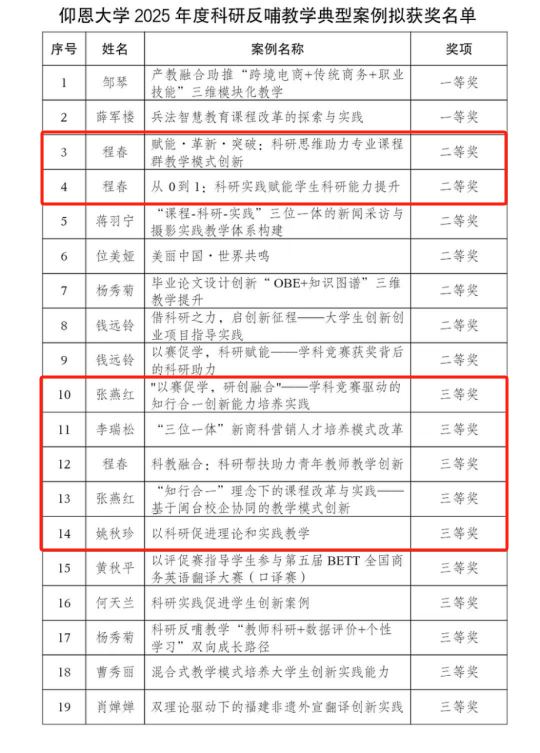 近日,太阳成tyc7111cc官网学术委员会公布2025年度科研反哺教学典型案例拟授奖名单,太阳成tyc7111cc官网4位教师上榜:程春副院长的《赋能·革新·突破:科研思维助力专业课程群教学模式创新》和《从0到1:科研实践赋能学生科研能力提升》2项案例荣获二等奖;张燕红老师的《“以赛促学,研创融合”——学科竞赛驱动的知行合一创新能力培养实践》和《“知行合一”理念下的课程改革与实践——基于闽台校企协同的教学模式创新》、李瑞松主任的《“三位一体”新商科营销人才培养模式改革》、程春副院长的《科教融合:科研帮扶助力青年教师教学创新》、姚秋珍老师的《以科研促进理论和实践教学》案例分别荣获三等奖。