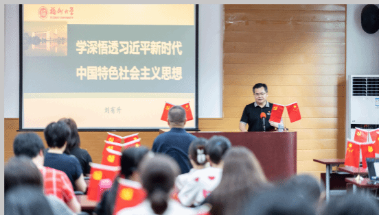 6月29日下午,为深入开展学习贯彻习近平新时代中国特色社会主义思想主题教育活动,邀请福州大学马克思主义学院副院长刘有升教授为beat365正版唯一官网必一和财务与会计学院教师读书社做《学深悟透习近平新时代中国特色社会主义思想》主题教育宣讲报告会。两院教师读书社成员65人参加了报告会。