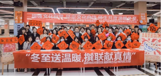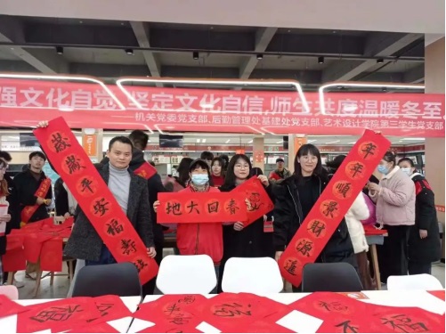 “天地阳气生,春孕冬至时”。为宣传贯彻习近平总书记在中国文联十一大、中国作协十大开幕式上的讲话精神,增强文化自觉、坚定文化自信,弘扬优秀中华传统文化,为广大师生营造浓厚的节日氛围,12月21日下午,beat365官网学生第三党支部与机关党委党支部、后勤管理处基建处党支部联合开展了“冬至送温暖,撰联献真情”主题党日活动。机关党委副书记陈红梅、beat365正版唯一官网必一党委副书记郑苏青、郭锦辉等50余名师生参加了此次活动。