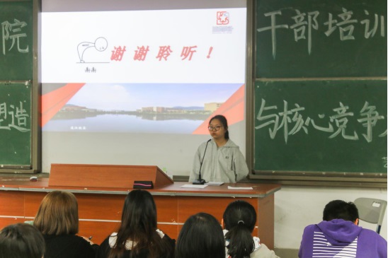 最后,团委学生副书记黄玲玲同学进行了总结,她表示,所谓学生干部,学生是身份,干部是责任,希望通过此次的培训会,各学生干部可以更好的展现自己的抱负和激情,锤炼品格、艰苦奋斗,不断书写奉献青春的时代篇章。