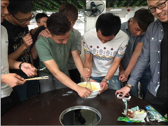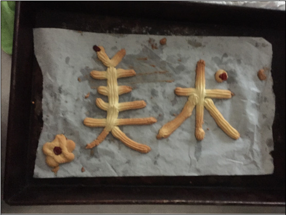 我们请了一位来自旅游系的学姐来教我们制作曲奇饼干。在师傅的细心指导结束后,大伙儿都按捺不住了,纷纷卷起衣袖开动了起来。“打蛋”、“搅拌”、“称重”这些听起来简单无比的几个步骤做起来却是手忙脚乱的。而后,在明确地分了几个小组之后我们的终于结束了“曲奇大战”缓缓地进入了正轨。在这之中我们不单单获得了DIY曲奇的技巧,也收获了耐心与团队合作。“造型”、“点缀”、“成品”从开始到结束,大家玩的开心极了,更多的是收获到了与同伴之间那层深深的“战友”情谊。在这里,没有划分部门,有的只是一个集体一个大家庭仅此而已。最后,大家DIY的各色曲奇都纷纷装盘进烤箱,更有的人将自己所在的部门名称也都DIY成了曲奇,接下来就是静静地等待十五分钟,等待着我们的作品,满怀期待着它的新鲜出炉。