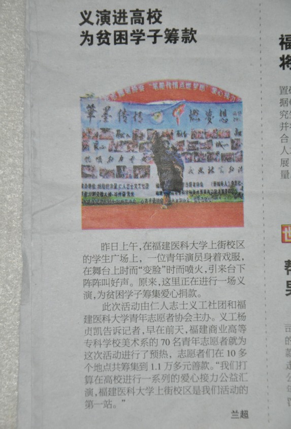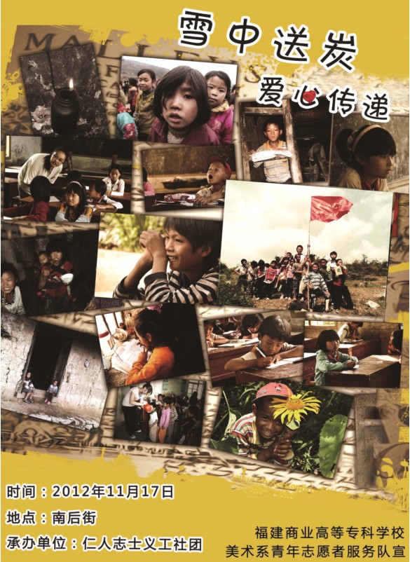 为了增强大学生与社会的联系,让更多的青年志愿者走进不同的生活环境,体验社会,展现自我,发挥出自己的爱心。同时尽己所能,给贫困山区的孩子提供一些力所能及的帮助,奉献我们的爱心,把友爱与宽容的种子撒播到各个角落,让宁化,永泰的贫困学生们感受到课堂外的关怀和帮助,能够真正解决当前出现的问题。商业美术系青年志愿者服务队与福州仁人志士义工社团合作开展爱心募捐活动。本次活动商业美术系共70名青年志愿者,分成10个小组在福州的多个地点进行义卖募捐。活动当天共募捐到了一万一千两百七十元的爱心款。