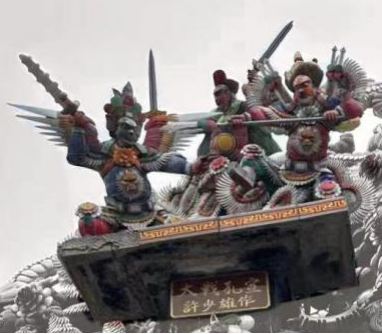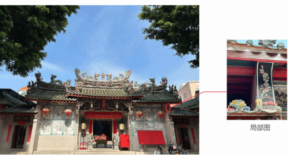 林陈玲:在本次实地考察的过程中,我对当地剪瓷雕的艺术形象来源有了更多的了解。起初我见到的大部分剪瓷雕大多主题恢弘,多是龙凤。而在实地考察的过程中,我还发现了许多结合了其他生活内容衍生而来的剪瓷雕作品。如屋檐下的红色锦鲤象征好运富足,通过剪瓷雕的形式,表现了当时人们对生活美好向往。在考察的同时,也见到了许多其他的当地人对生活的愿景以不同民族信仰的传说形象通过剪瓷雕的形式表达出来,让我对传统文化有了更深的理解。