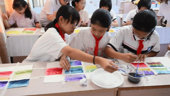 实践队走进钟厝村鸢峰小学,带领孩子们用海盐创作肌理画,并将畲族传统纹样融入斗笠设计,让古老文化在年轻一代的指尖焕发新生。欢声笑语间,畲族文化与海盐非遗知识的种子悄然播撒在孩子们心中。
