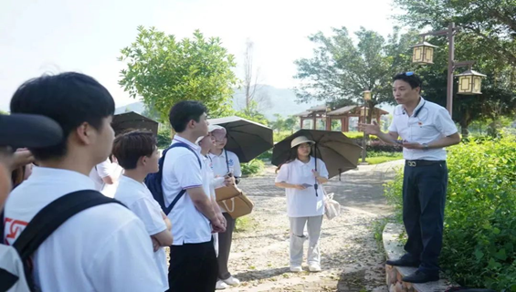 在东岱镇蝉步村,队员们跟随着老师的步伐,沿着河岸进行实地考察并实时绘制讨论方案,查看了水陆地势和水体流向后,结合当地的垂柳景观,先锋队成员提出了“春暮絮飞清影薄,夏初蝉噪绿阴多”的景观设计理念,对岸边的果蔬种植基地和栏杆石材也进行了分析,为后续设计方案打下坚实的基础。