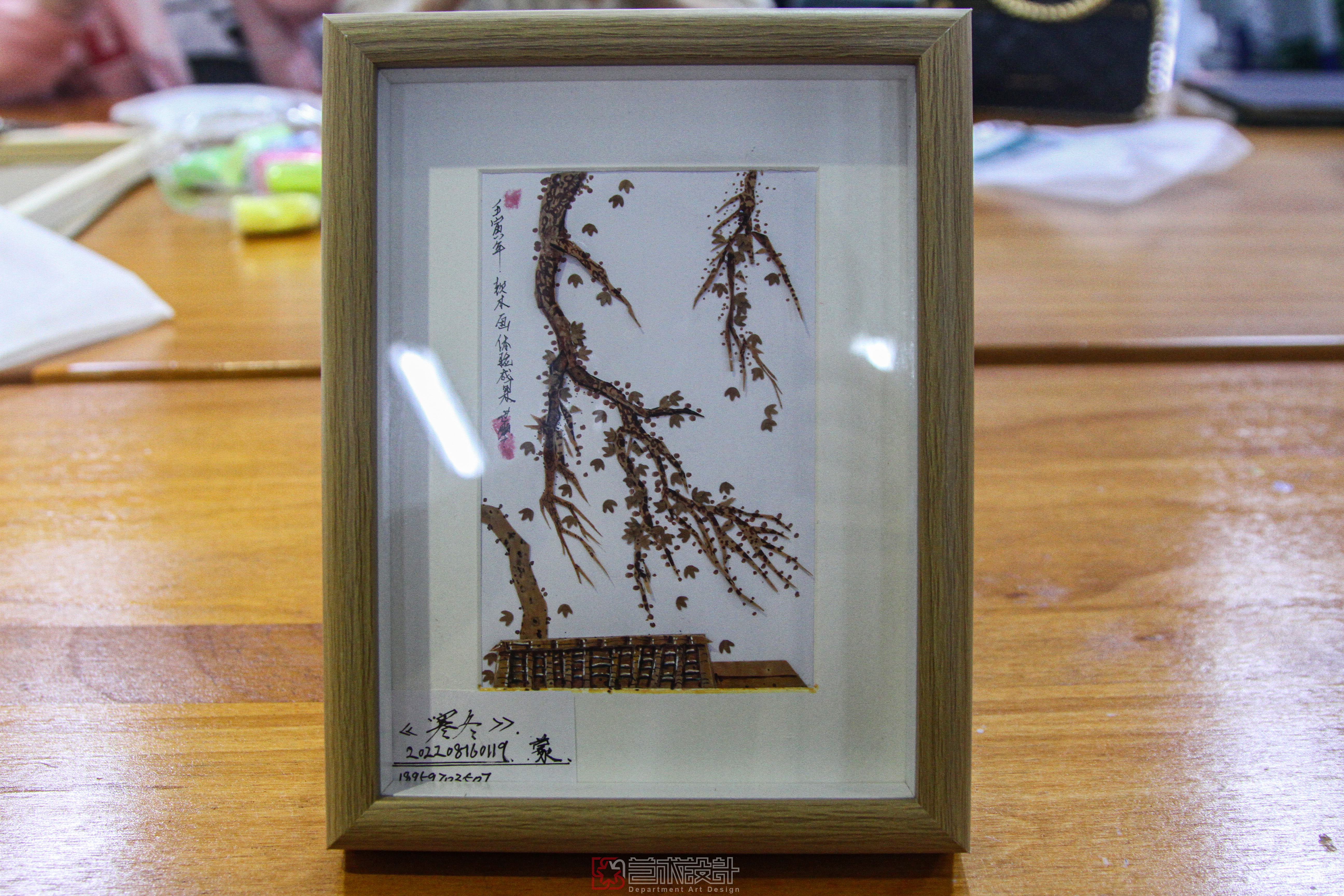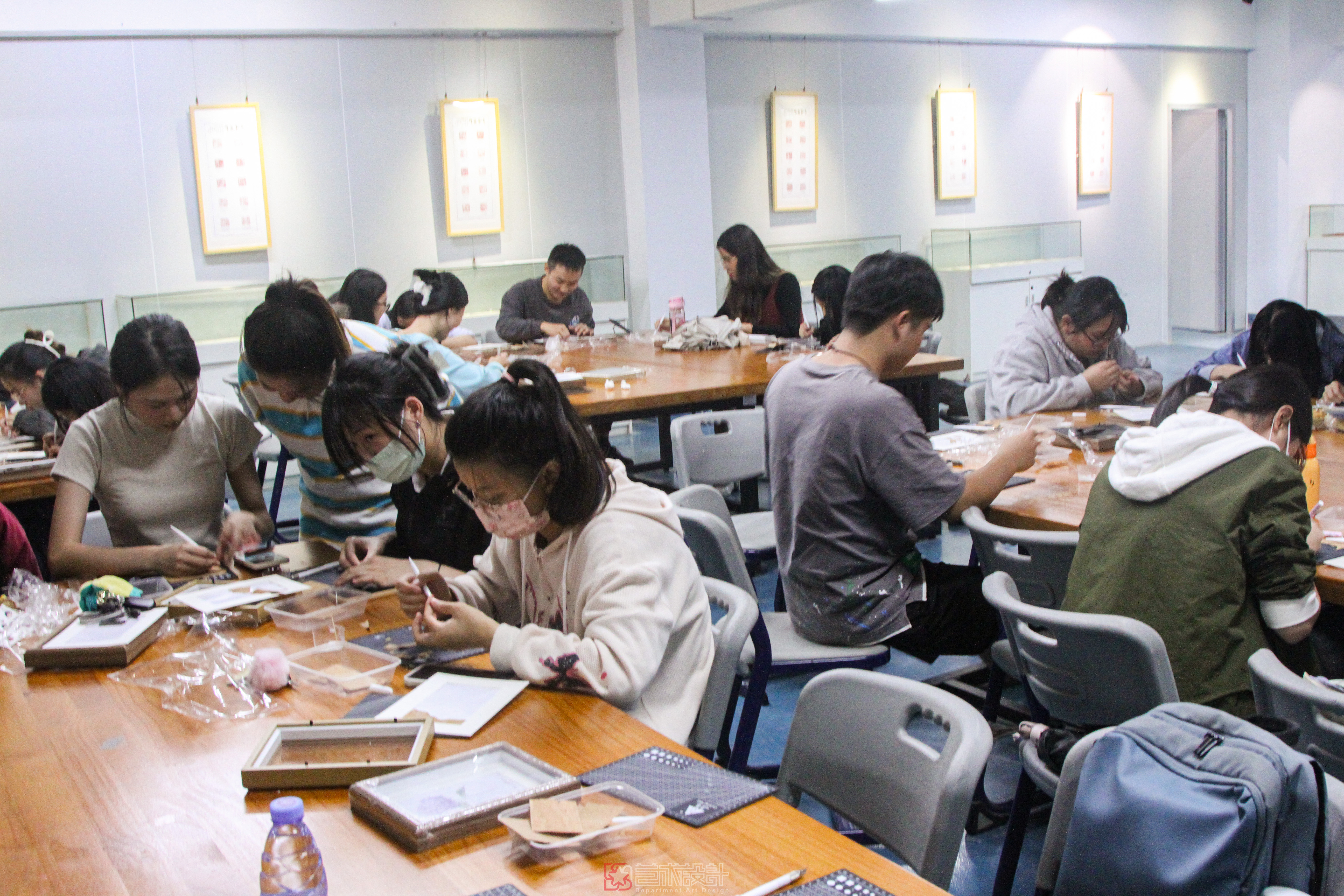 郭丽老师以传承人的视角详细讲解了软木画的历史起源、发展现状、制作技巧,随后熟练地进行示范,当一件件复杂精美的作品出现在眼前,同学们亲眼看见非遗传承人郭丽老师的软木画制作过程后,才见识到这项技术的不易,惊叹于老师的技艺,同时对于软木画的兴趣愈加强烈。随后,同学们上手尝试,发挥自己的灵感,结合软木画技术,开始创作实践动手设计自己心目中的软木画。郭丽老师则在同学们身边悉心指点,让想法不受技法的限制,皆是制作出了让人满意的作品。同学们纷纷表示受益匪浅,愿意多加学习软木画技术,为非遗的传承贡献自己微薄之力。