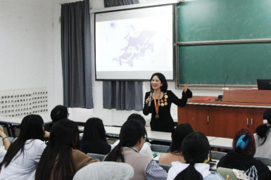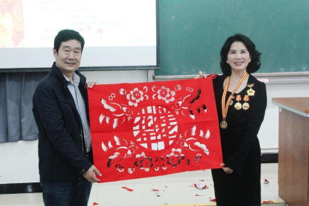 高老师讲述了自己与剪纸的渊源以及自身四十多年来致力于漳浦剪纸艺术的挖掘、抢救、传承和发展的经历。将通过剪纸外交促成外交美事等故事娓娓道来,并展示了她的代表性作品。其中,《爷爷奶奶》系列作品引起大家对家乡及亲人的思念。《两岸一家亲》、《一带一路大篇章》、《站起来富起来强起来》等作品充分展现了当代剪纸传承人紧跟时代脉搏,用手中的剪刀讲好福建故事、讲好中国故事的使命与担当,更是带动同学们对祖国的情感,增强文化自信。