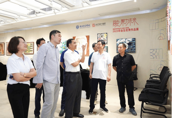 福建省文联党组书记王秋梅(右三)在校长程灵(左三)的陪同下参观展览