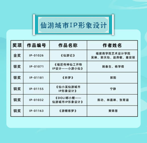 据悉,本届大赛共征集到全国各地关于“仙游城市IP形象设计”、“中式家具单品设计”、“福文化·仙工开物文创好礼”三个类别参赛作品1309件。经过评审,最终评出“仙游城市IP形象设计”、“中式家具单品设计”、“福文化·仙工开物文创好礼”三个类别金奖各1名,银奖各2名,铜奖各3名,以及“中式家具单品设计”、“福文化·仙工开物文创好礼”优秀奖各10名。