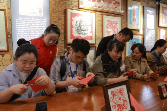 在靴岭尾村,学员们参观了红纸屋、剪纸大师馆和非遗展示馆,深入探寻柘荣剪纸这门古老的民间艺术,对柘荣非遗文化有了更全面的了解。在互动环节,学员们体验了非遗剪纸技艺,剪纸老师悉心教授剪纸的基本技法,学员们认真学习、仔细揣摩、上手操作,以切身实践感受柘荣剪纸“一折一转,一刀一剪”的独特魅力。