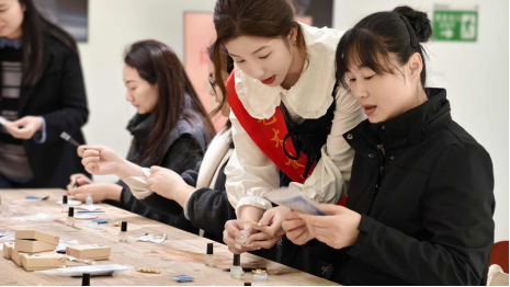 “指尖芳华”胸花制作区,非遗螺钿技艺与现代设计交织出别样魅力。女教师们以镊为笔、贝为墨,精心设计图案,将破碎的贝壳重组,镶嵌出兼具古典韵味与时尚气息的胸花。一枚枚精致的胸针流光溢彩,尽显参与者们的创意和技艺,仿若“行走的艺术品”。