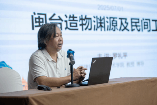 7月1日上午,福建师范大学美术学院院长、美术馆馆长罗礼平教授带来《闽台造物渊源及民间工艺》主题讲座,深入剖析两地文化脉络与工艺传承。讲座中,罗教授从福建文化地理变迁切入,讲述古闽时期至近现代的历史演变,提及客家女、湄洲女等族群文化符号。他以崇蛇造物为线索,解析闽台共有的蛇图腾崇拜,通过岩画、陶器蛇纹及服饰纹样,展现两地文化同源性。此外,罗教授介绍高山族传统工艺,分析图腾崇拜对造物的影响以及现代传承与创新举措。这场讲座让学员深刻感受到闽台民间工艺的独特魅力与文化渊源,引发广泛共鸣。