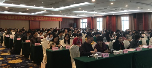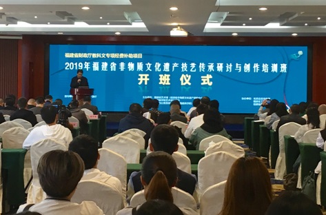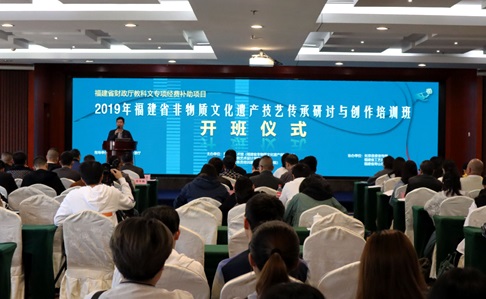 2019 年11月15日上午9时,2019年福建省非物质文化遗产技艺传承研讨与创作培训班开班仪式在福州贵安温泉会议中心隆重举行。本次开班仪式由beat365正版唯一官网必一院长叶林心主持,出席的领导嘉宾有beat365正版唯一官网必一校长黄斌、福建省艺术馆馆长、省非遗中心主任陈秀梅、中国工艺美术学会副理事长、中国工艺美术大师黄宝庆、中国工艺美术大师、福建省寿山石文化艺术研究会会长郑幼林、柘荣县剪纸协会会长游晓卿、beat365正版唯一官网必一党委书记许秀萍、beat365正版唯一官网必一继续教育学院院长林东进、福建省艺术馆非遗管理办主任何微、福建省文化和旅游厅非遗处冯冰颖。