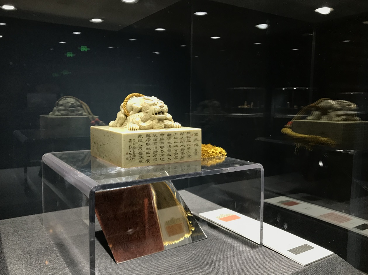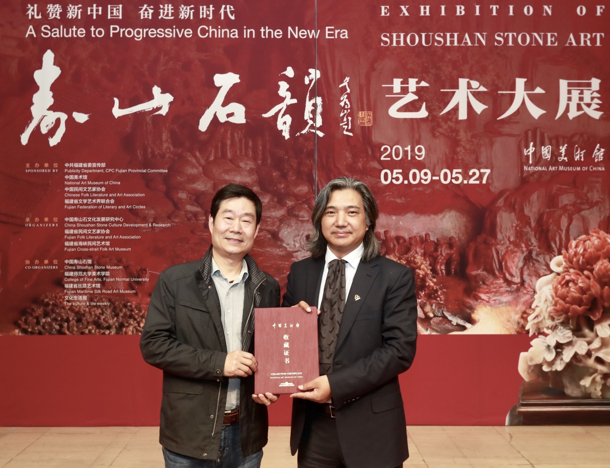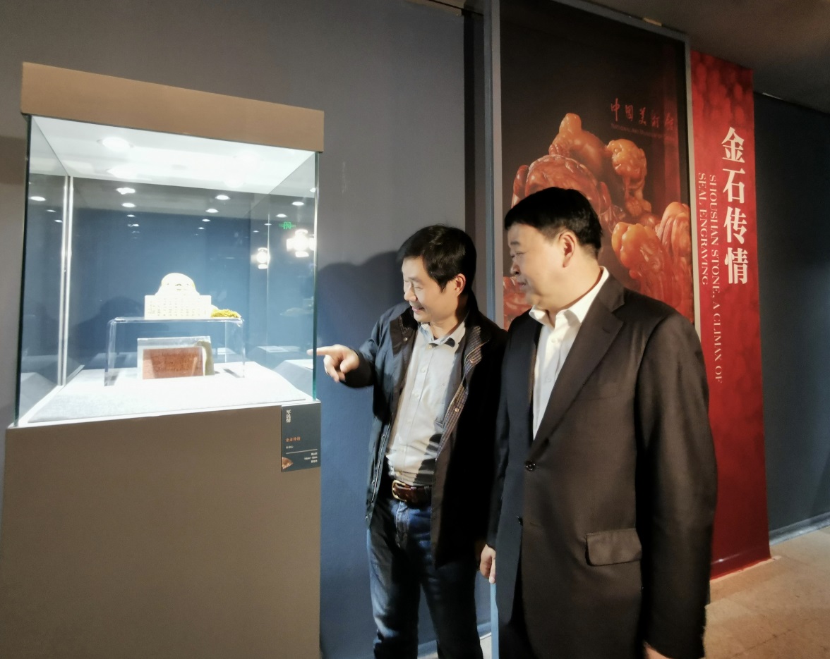 5月9日“礼赞新中国 奋进新时代——‘寿山石韵’艺术大展”在中国美术馆隆重开幕,本次展览由中共福建省委宣传部、中国美术馆、中国民间文艺家协会、福建省文学艺术界联合会等单位联合主办,礼赞新中国成立70周年,歌颂奋进的新时代,全面系统地对雕刻、技艺、传承等寿山石文化进行梳理,全景式地展现了八闽大地千年寿山石文化的丰富内涵与外延,是迄今为止规模最大的寿山石艺术展。此次大展被纳入“亚洲文明与对话大会”系列活动之一。 beat365官网beat365正版唯一官网必一院长、福建省篆刻学会副会长、著名篆刻家叶林心教授,以习近平主席在闽工作期间撰写的七律诗《军民情》创作的篆刻大印,以及《不忘初心》两方大印章参加了本次展览,其中《军民情》作品并被中国美术馆收藏。此篆刻作品印面宽15cm,所作取法高古,结体严谨,章法平稳,布局均匀,错落有致,刀法细腻,线条古趣盎然。该印文多达56字,而极尽穿插呼应,运用自如,笔笔精到,宛若天成。