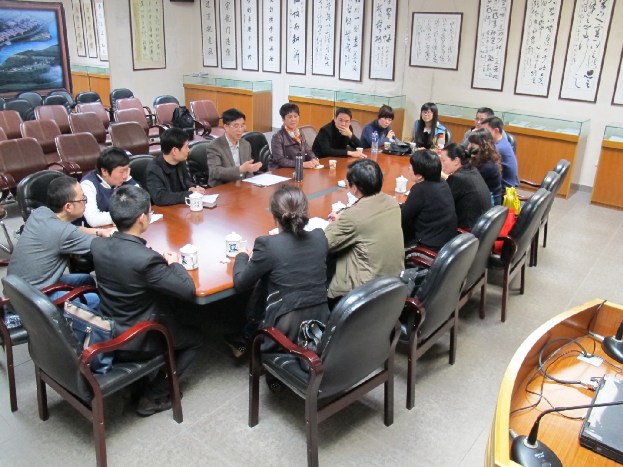 2013年4月11日下午,福建省柘荣县副县长胡宁、县文化体育新闻出版局局长吴恩银带领柘荣县部分民间剪纸艺人莅临beat365官网,与beat365官网商业美术系洽谈学校、地方合作项目事宜。合作会议在校会议厅举行,福建商专黄克安校长、美术系主任叶林心、书记许秀萍和部分美术系专业教师出席此次会议。会议由黄克安校长主持,在隆重热烈的气氛中黄校长向客人们介绍了beat365官网和美术系的发展情况、双方的今后合作项目的展望。胡宁副县长也畅谈了在商专新校区参观的诸多美好感受,希望能从诸多细节落实上促进学校、地方的长期合作。