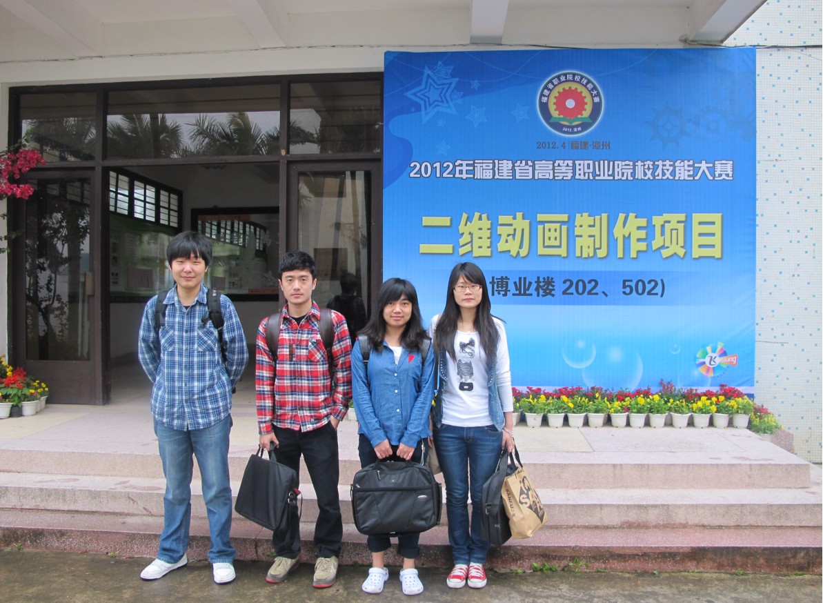 2012年4月25日—28日,福建省高等职业院校技能大赛在漳州职业技术学院隆重举行。本次大赛共设置了17个类别24个竞赛项目,来自全省各地64所高职院校的1200多名选手参加了本次大赛,其中“二维动画制作”项目有37个院校,148人参加比赛。最终我系动漫班:赵斌、王毅、方晓琳、卓文琼四位同学突出重围获得了一等奖的优秀成绩。